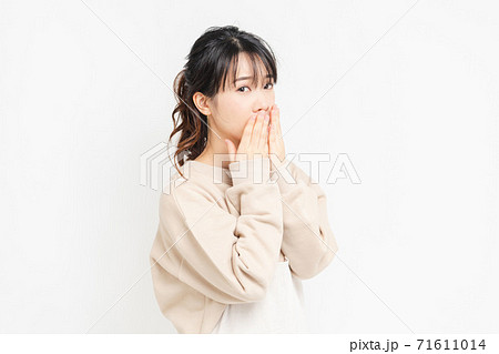 手で口を隠す若い女性の写真素材